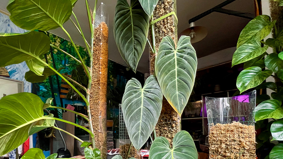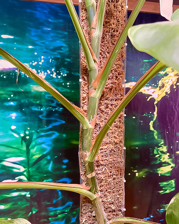 Moss poles help climbing plants mature indoors, mimicking the natural growth pattern they have when growing attached to a tree, as they grow in the tropics.